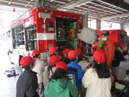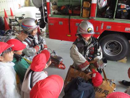 消防署にある車両を見たり、実際に出動するときの服などを着たりさせていただきました。