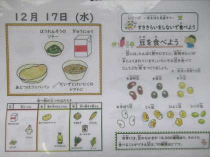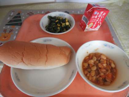 味つけコッペパン、牛乳、大豆と鶏肉のトマト煮、ほうれん草のソテー