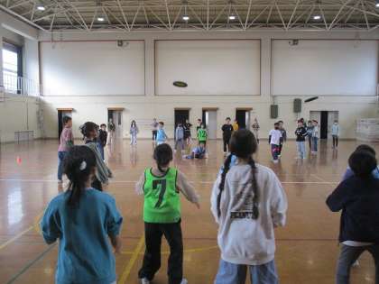 次に、フリスビードッヂをしました。雪だるま役を作るなど、遊びに工夫を凝らしていました。できるだけ多くの人がフリスビーを投げられるように、フリスビーをキャッチしたときに、譲るようにしていたところが、とても素敵でした。