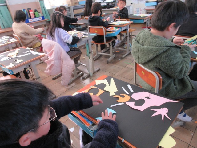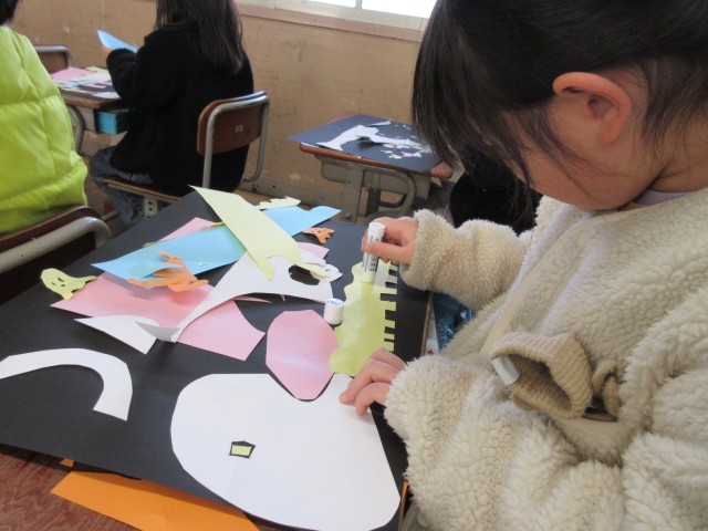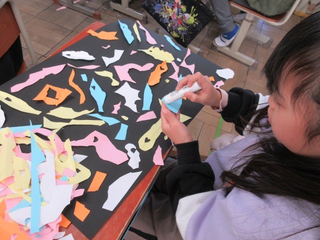自由に紙を切って、どんな様子に見えてくるか考えました。切った紙を黒い紙の上にならべて、自分の感じ方の世界を表現しました。教室では「どんな並べ方にしようかな。」という呟きが多く聞こえてきました。楽しみながら思い思いのアートを作っていました。