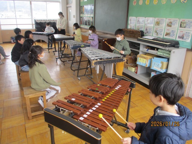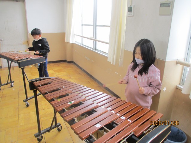 「ようすをおもいうかべよう」の学習では、「きらきらぼし」の星空のようすを思い浮かべながら、歌を歌ったり、けんばんハーモニカで演奏したりしてきました。今日は、音楽室で鉄琴や木琴をつかって演奏をしました。「きれいな音だな」「かわいい音がするよ」と、音色を聞きながら演奏することができました。
