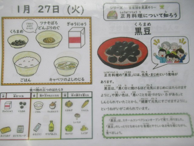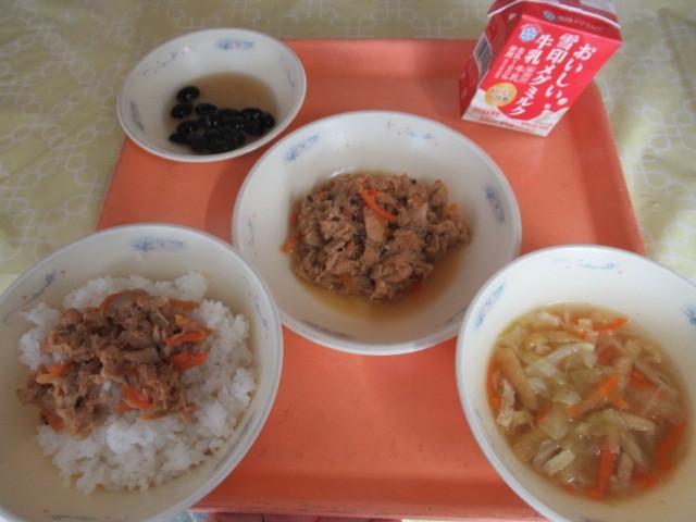 ごはん、牛乳、ツナそぼろ丼(具)、黒豆、キャベツの吉野汁