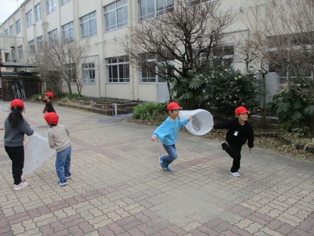 生活科の学習では、凧やビニール袋を使って、かぜで遊びました。風を捕まえるために、「はやく走ったほうがいいね」「手をもっと上にしてみよう」など、楽しむだけでなく考えながら取り組む姿が見られました。寒い中でしたが、元気いっぱいに取り組むことができました。