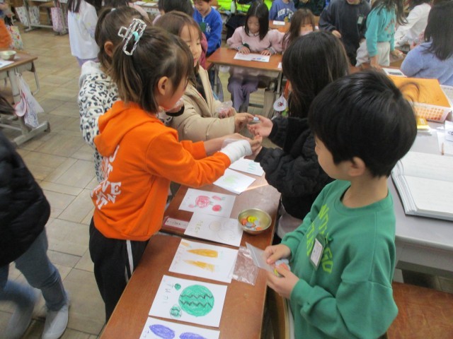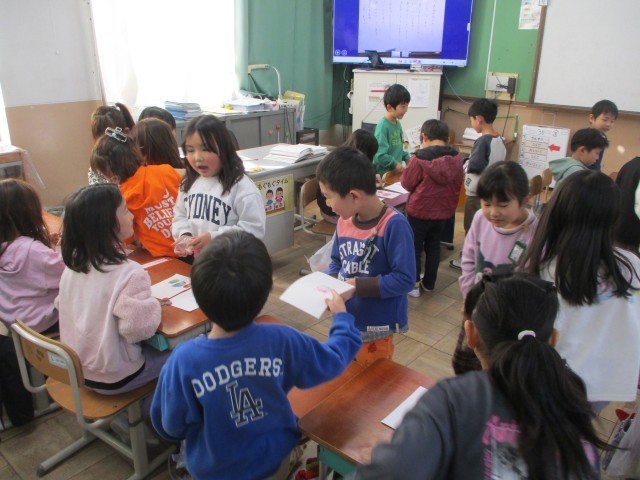 国語科「もののなまえ」の学習では、集めたものの名前を使って、おみせやさんごっこをしました。今回は、先々週に算数科で学習した「お金」も使って行いました。「いらっしゃいませ。」「60円です。」「ありがとうございます。」など、どのお店からも活発なやりとりの声が聞こえ、楽しく学習に取り組む姿が見られました。