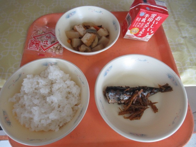 ごはん、牛乳、いわしのしょうが煮、関東煮(昆布入り)、いり豆