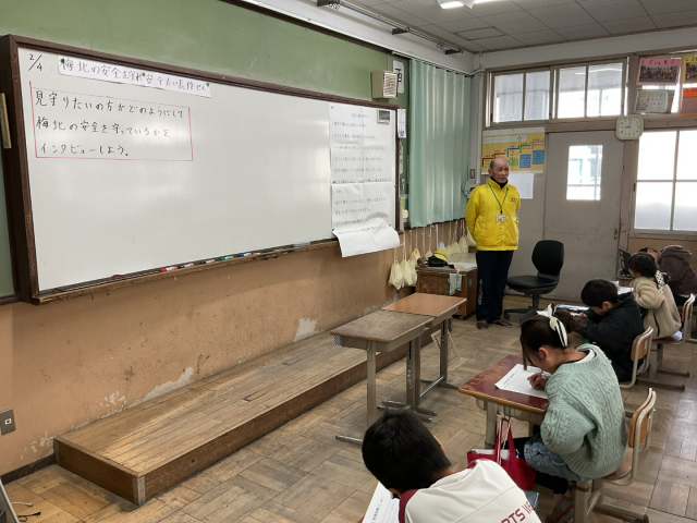 総合的な学習の時間に、見守り隊の方々に出前授業をしてもらいました。いつも正門や北門前で挨拶をしてくださったり、子どもたちを見守ってくださったりしている方々に、自分たちが疑問に思っていることや、見守り隊をしていることへの思いを聞くことができました。いつも身近にいて、自分たちの安全を守ってくださる人たちに話を聞くことで、子どもたちはより一層安全に対する意識を高めていきたいという思いをもつことができていました。また、今回の出前授業を通して、次は自分たちが梅津北小学校の安全を守っていくために出来る事ややってみたい事を考えていきます。