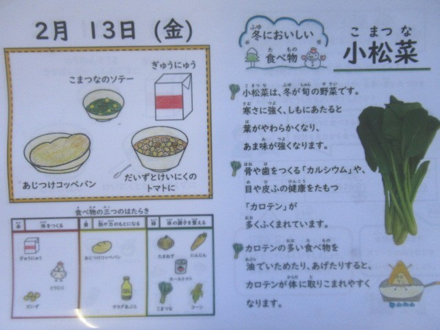 味つけコッペパン、牛乳、大豆と鶏肉のトマト煮、小松菜のソテー