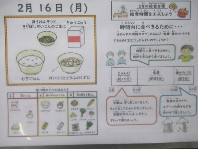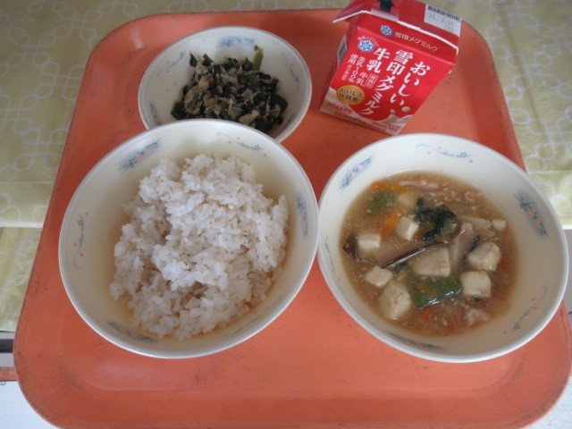 麦ごはん、牛乳、鶏肉ととうふのくず煮、ほうれん草と切干大根のごま煮