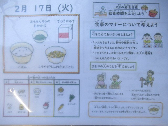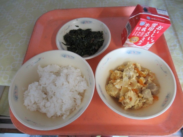 ごはん、牛乳、高野どうふの卵とじ、ほうれん草のおかか煮