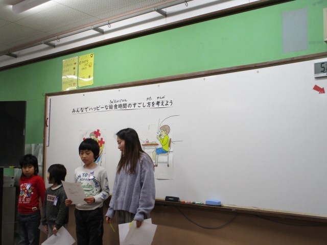 学活では栄養教諭の佐藤先生から食事のマナーについて教えてもらいました。食べ方のイラストを見てよくないところに気づき、自分の食べ方について振り返っていました。「姿勢を正して食べること」「食器をしっかりと持って食べること」「足を床につけて食べること」などこれから意識していきたいこともそれぞれが考えることができていました。