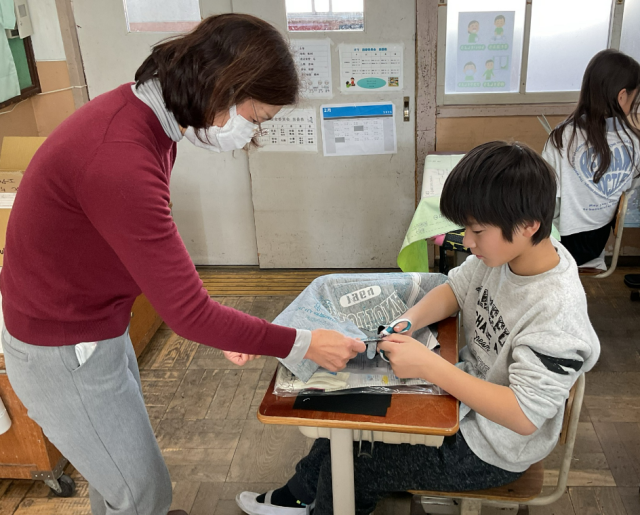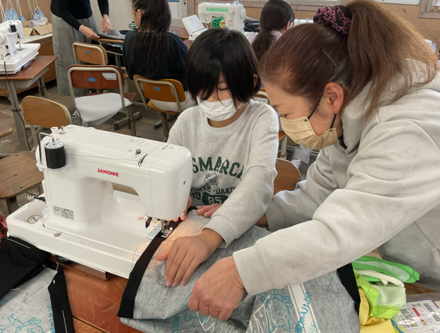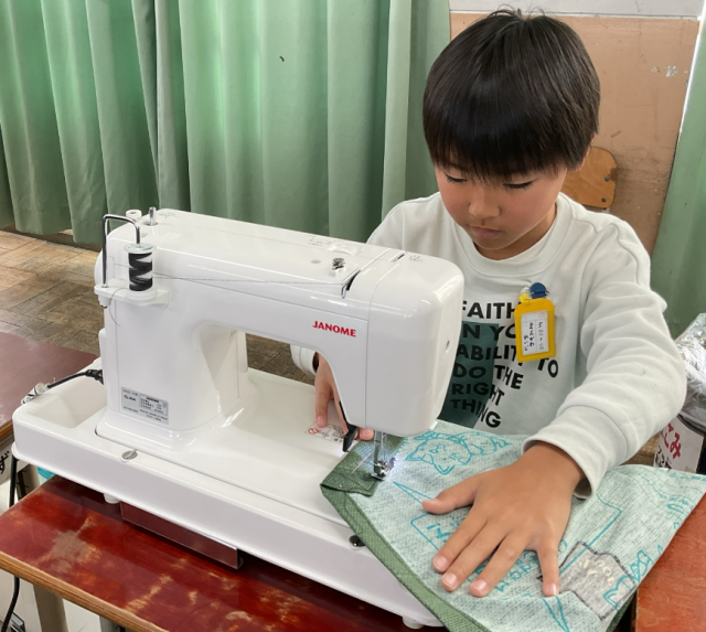家庭科の授業で、ミシンを使ったエプロン作りに取り組んでいます。民生委員の方に授業に来ていただき、サポートをしてもらっています。子どもたちも安心して活動できています。