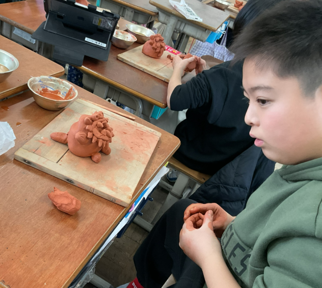 図画工作の授業でシーサーを作りました。楽しみながら作品作りに取り組んでいました。2月25日、26日の作品展に展示する予定ですので、ぜひご覧ください。