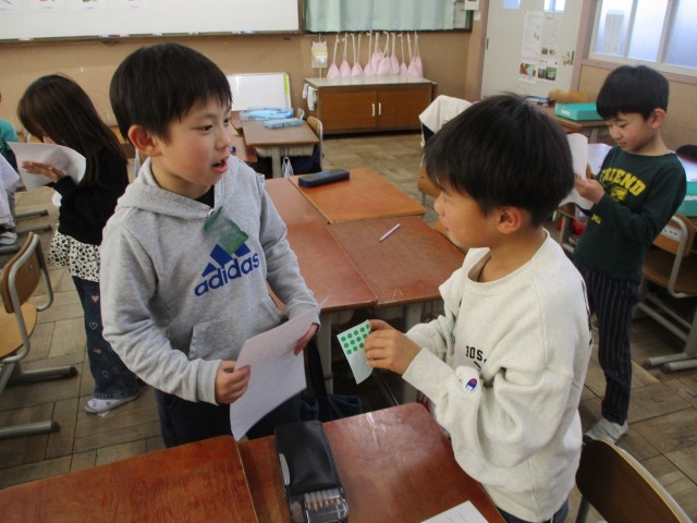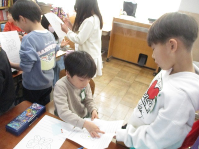 英語活動の学習では、ほしい色のシールを英語で伝え、やりとりする学習をしました。子どもたちは、今まで学習した「色」を英語で伝えながら、もらった色シールをちょうちょのはねに貼ることができました。色シールを貰う方も渡す方も楽しみながら取り組む様子が見られました。