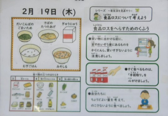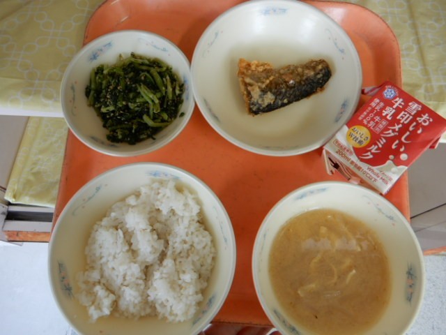 麦ごはん、牛乳、さばのたつたあげ、だいこん葉のごまいため、みそ汁