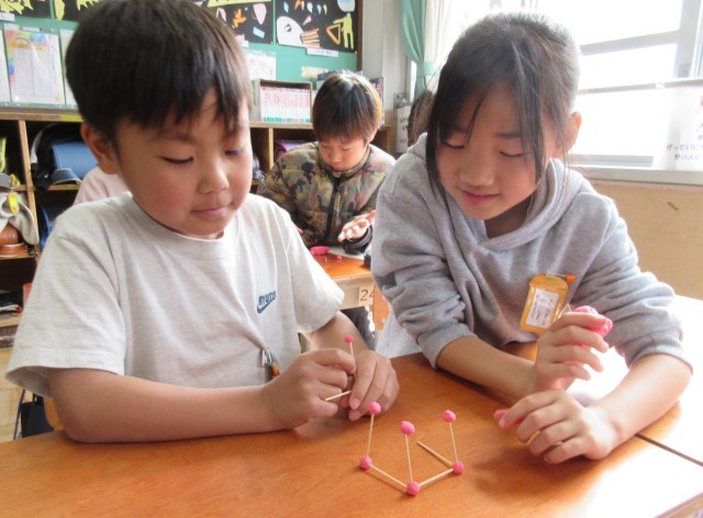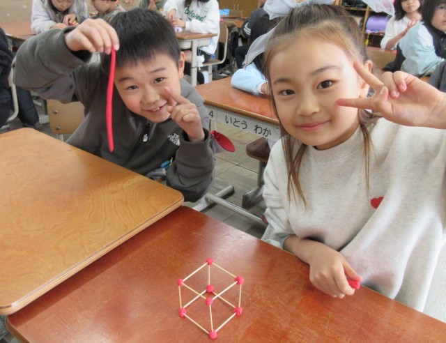 算数の学習で、箱はひごと粘土がいくつあれば作れるのかを考え、実際に作ってみました。