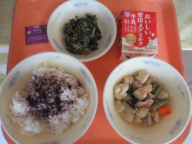 麦ごはん、牛乳、高野どうふと野菜のたき合わせ、ほうれん草ともやしのごま煮、ふりかけ