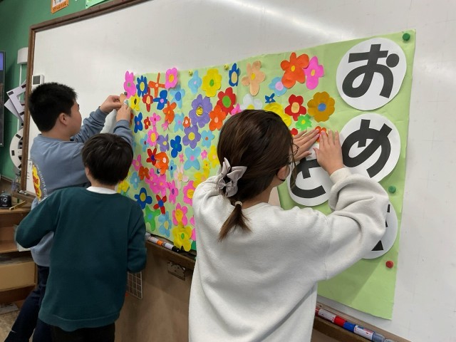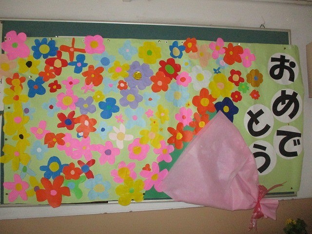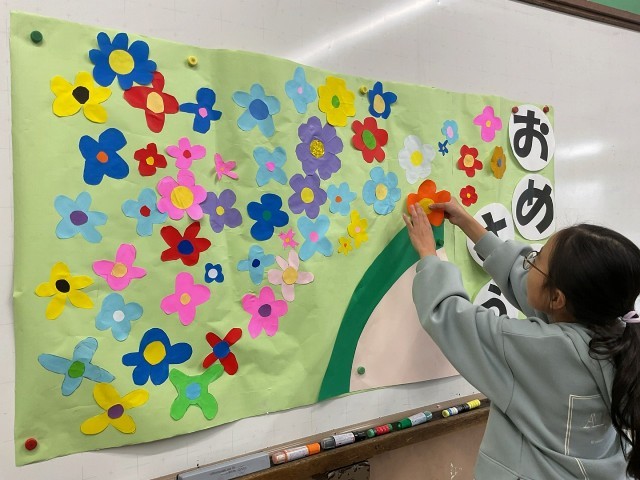 これまでお世話になった6年生に、みんなで花束の大きな飾りを作成しました。