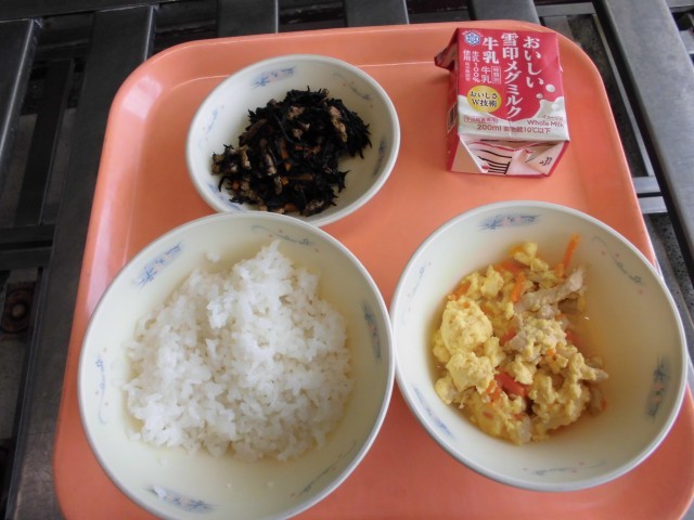 ごはん、牛乳、親子煮、ひじきの煮つけ