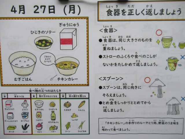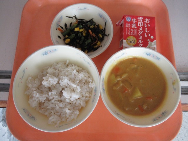 麦ごはん、牛乳、チキンカレー、ひじきのソテー