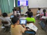 外国語活動「I like blue.」の学習では、相手に伝わるように工夫しなが...