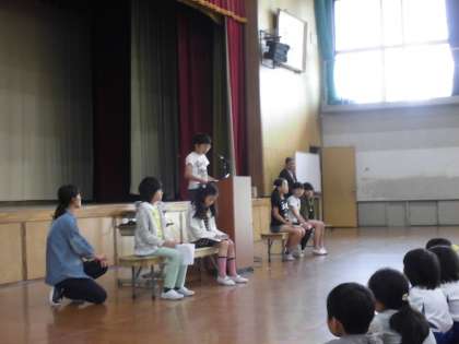 6月12日(月)朝会の後は, 今年度初めての「西京極タイム」です。はじめに, 各学年(低・中・高学年)ごとの「聞くときのめあて」を確認し, その後, 4年生児童が, 「このごろ心がふるえたこと」「心が動いたこと」をテーマに作文を発表しました。どれも, 児童の「どきどきしたこと」や「嬉しかったこと」や「感動したこと」などがよく伝わってくる発表でした。その後, 各学年から代表児童が1名ずつ前に出て, 感想を発表しました。自分と比べて思ったことなど, しっかりと感想を述べました。本校では, このように, 相手に自分の思いや考えを伝えるための表現力を高めたり, 相手のおもいや考えを受け止めて, 自分の考えをもって聞く力を育てたりするための取組として, 年間6回の「西京極タイム」を実施しています。