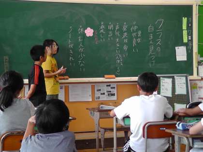 自分のクラスのすてきなところは,どこだろう・・・とみんなで話し合っているところです。「毎日,みんなが元気であること」「給食を完食するところ」「男女仲がよいところ」「発表を頑張っているところ」「ノート作りを頑張っているところ」などたくさん出ましたが,その中から絞ってお花の形をした画用紙にかきました。