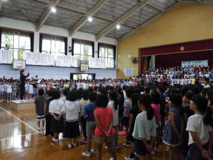 9月10日(日)日曜参観の1・2校時は, 全校音楽集会をしました。これは, 「全校みんなで歌う楽しさや喜びを味わうこと」「他学年の歌声を聴き, 自分たちの表現に生かすこと」をねらいとした. 全校で行う音楽の学習です。「各学年の発表」「感想の交流」の後, 全校合唱で「U&I」を歌いました。西京極小学校みんなの心が一つのハーモニーとなって, 体育館中に響き渡りました。歌詞に込められた意味を大切にして歌うことで, 「思いやりのある心やさしい子ども」に成長していくことを願っています。