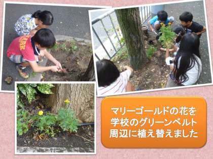ほっておいては枯れてしまいます。何かいい考えはないかと考えていましたが,学校のグリーンベルトに植えてはどうかという案が出てきました。早速子どもたちは,スコップを持って学年全員でマリーゴールドの花を植え替えにいきました。