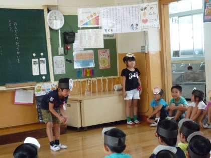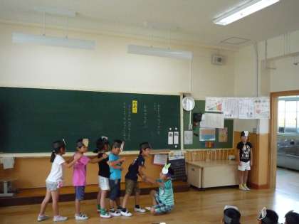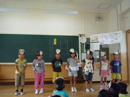 国語科の学習で,「おおきなかぶ」の音読発表会をしました。それぞれの役に分かれて,子どもたちはその役になりきりながら発表をしました。初めてで緊張している子どももいましたが,見るのも演じるのも楽しかったと,とても生き生きとしていました。