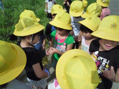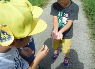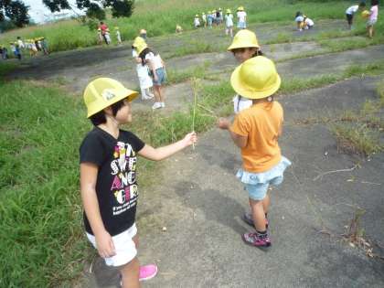 生活科の学習で,桂川の河川敷に行きました。たくさん秋の虫を見つけたり,葉っぱで遊んだりしました。子どもたちは,虫に気付かれないように静かに近づいて,かくれんぼしている虫をたくさん見つけることができました。