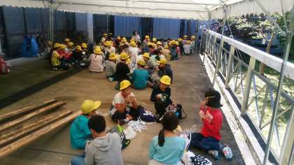 テラスで班ごとに昼食を食べました。外で食べるおにぎりはとてもおいしかったです。