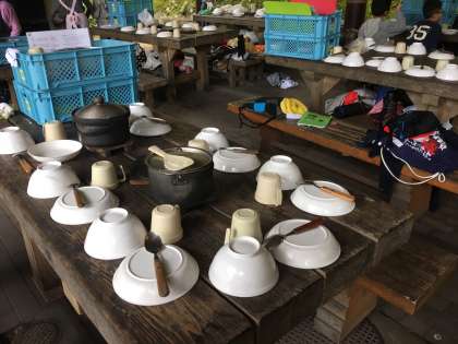 一回目の野外炊事の経験を生かし、灰がお皿に入らないようにリーダーさんが工夫して食器を並べていました。