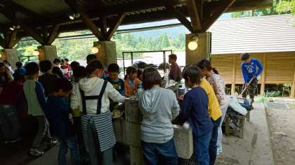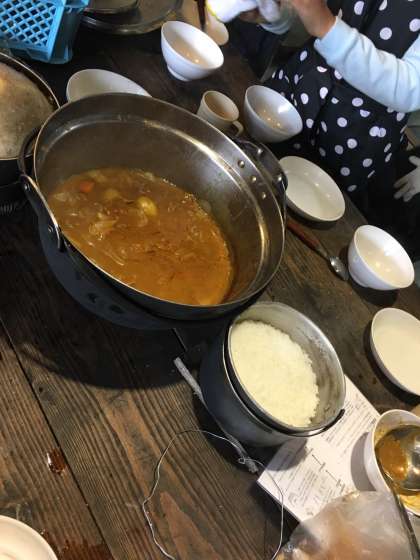 美味しくできたカレーとご飯をいただき、みんなで協力して片付けをしています。