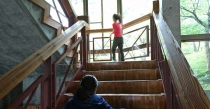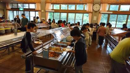 お風呂に入ってさっぱりと汗を流しました。午後5時から山の家での最後の夕食でした。