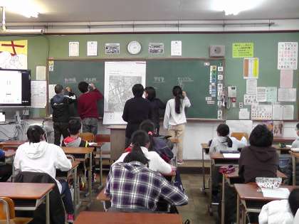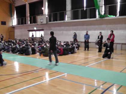 12日(金)の午後にプレ中学生がありました。西京極中学校へ行って,学校紹介を聞いたり体験授業を受けたりします。まず,体育館で行われた学校紹介,生徒会の生徒たちが司会進行をして立派に話していました。小学生の子どもたちは,緊張しながら話を聞いていました。制服の着こなし方についても紹介があり,楽しませてもらいました。