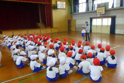 初めての体育の授業で,「ならびっこ」をしました。最初に名簿の順で並ぶ練習をして,次はゲーム「かもつれっしゃ」をしました。