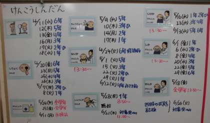 春の定期健康診断が始まりました。4月から6月までびっしりあり,ほとんど毎日どこかの学級が健康診断を受けています。