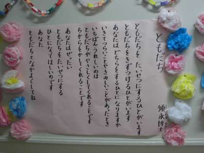 4月は友だちについて考えさせる詩です。友だちを大切にするとはどういうことなのか。この詩を読んで振り返ってほしいと思います。