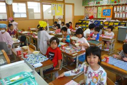 給食が配られるのを今かいまかと自分の席で待つ1年生。たくさん食べて明日からも元気にがんばります。