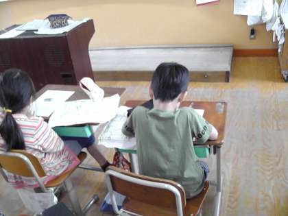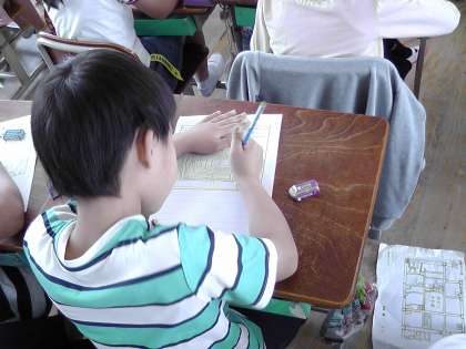 3年生,校区たんけんへ行った後に,教室で校区たんけんで見つけたものをはっけんカードにかきました。みんな,もくもくと一生懸命かいていました。校区の地図にも見つけたものをたくさんかきこんで,色わけもしていました。はっけんカードをかくことにも慣れてきた様子です。