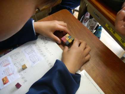 体積は1辺が1センチの立方体が何個分あるかで表すことができます。今日は実際に1センチの立方体を積み重ねていろいろな直方体や立方体を作り,それらの体積を考えました。