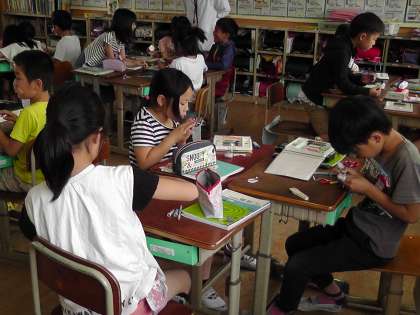こまの面に点をかいて,こまを回した時に,点がどのような形をえがくのか確かめてみました。丸い形のこまも四角い形のこまも,どのこまでも点はまるい形を描いていたことを子どもたちは見つけていました。