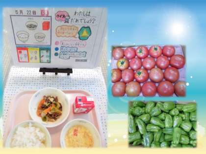 5月22日の献立はごはん,牛乳,焼肉,トマトと卵のスープでした。給食室にはとても良質なトマト,ピーマンが届きました。大人気の焼肉はおかわりの行列ができていました。トマトと卵のスープもたべやすく,この日も食缶をからにして返してくれました。