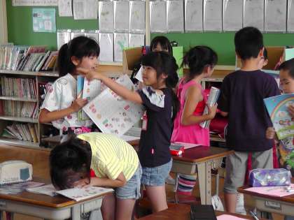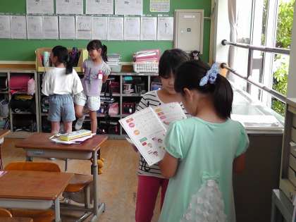 How many〜?の表現を用いて友だちに数をたずねる学習をしています。りんごの数をたずねたり,漢字の画数をたずねたり,回を重ねるにつれ,だんだんと表現に慣れ親しんでいます。友だちとの活動も楽しそうです。