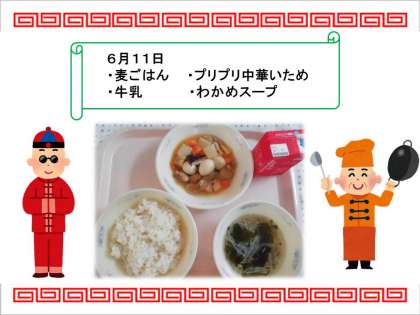 6月11日の給食は,みんながすきな「プリプリ中華いため」でした。中間休みに「今日プリちゅうやー!やったー!」と喜んでる子もいました。この日は2年生の教室で一緒に給食を食べました。先生も子供も大好きなプリ中,おかわりの行列がたくさんできていました。