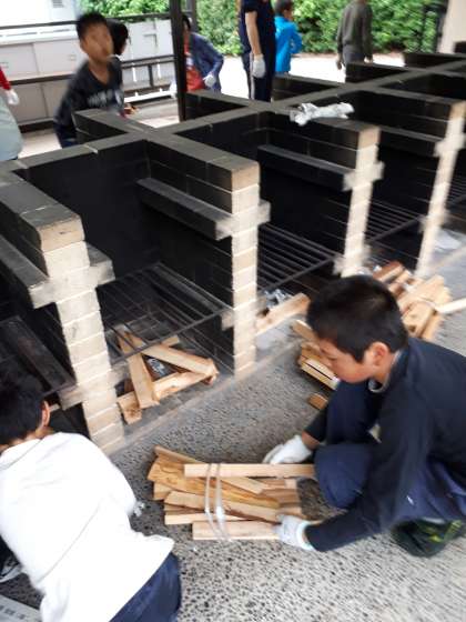 野外炊事が始まりました。先生の話を集中して聞いていました。