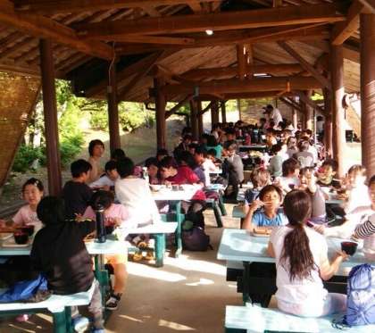 あづま屋で,班ごとにそろって食べ始めました。