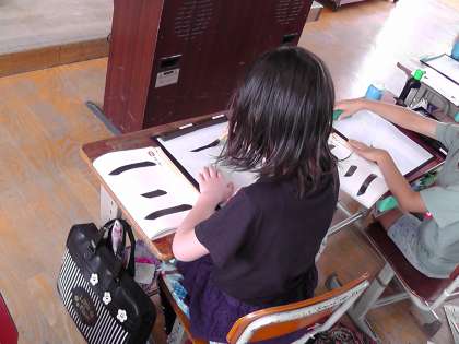 書写の学習では,横画に気をつけて「一」「二」の漢字を書きました。筆圧や穂先の向き,文字のバランスなどたくさんのことを意識して清書をしました。少しずつ上手になってきています。