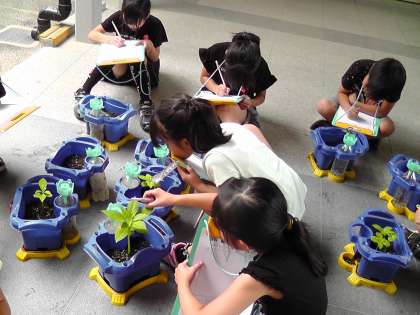 理科「植物をそだてよう」の学習では,ホウセンカの本葉の観察をしました。形や色,大きさ,土からの高さ,触った漢字などよく見ていました。また,子葉との違いを意識して観察しました。これからの変化も楽しみです。