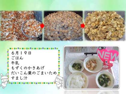 6月19日の給食は新献立のもずくのかきあげでした。もずく,ちくわ,たまねぎ,にんじんをいっしょにかきあげにしました。学校ではよりもずくを感じてもらえるように,衣にも,もずくを混ぜ合わせています。さくっと揚がったかきあげは子どもたちにも好評で,「もずくおいしい」「家でももずくよくたべる」などもずくトークをくりひろげてくれました。